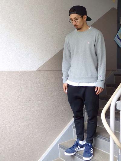 スウェットとスニーカーをラフにコーデ。ネイビーのスニーカーは品があり、スウェットスタイルでもラフすぎない雰囲気を作ってくれる。